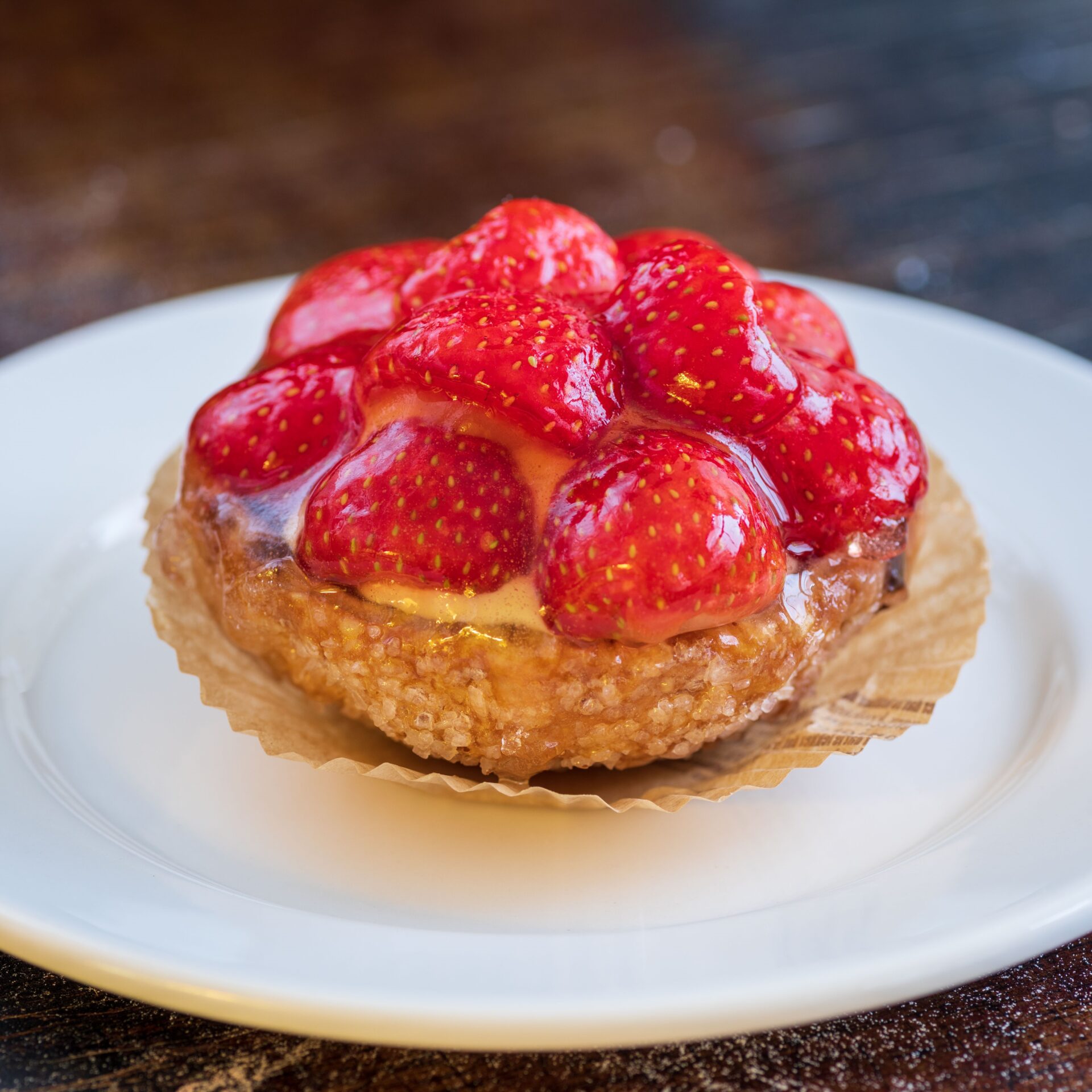 Heerlijke aardbeienschelp! Gemaakt van een krokante schelp met een dun laagje chocolade, Zwitserse room en verse aardbeien.
