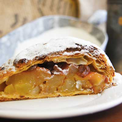 De Apfelstrudel is het meest bekende Oostenrijkse gebak. De frisse smaak van de stevige appel samen met Turkse rozijnen, geeft deze Strudel haar specifieke smaak. De Apfelstrudel is gemaakt van korstdeeg en is warm het lekkerst.