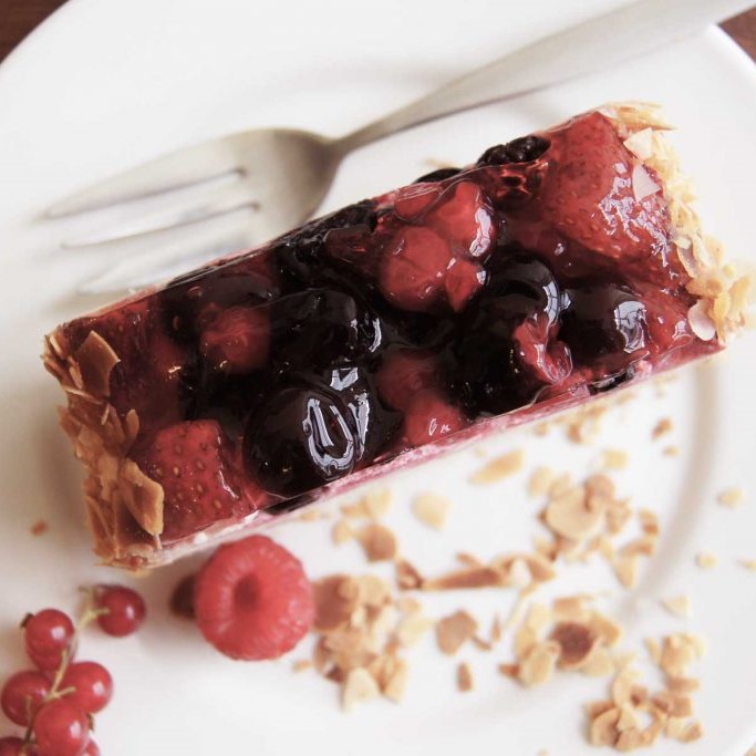 Luchtige biscuit gevuld met frambozenslagroom en een vleugje Cointreau en belegd met bosvruchten. Lekker fris en fruitig!