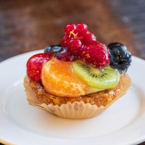 Heerlijke vruchtenschelp! Gemaakt van een krokante schelp met een dun laagje chocolade, Zwitserse room en wisselend vers seizoensfruit.